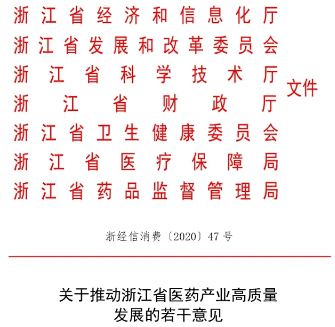 近日,浙江省發(fā)展改革委、省經(jīng)信廳、省科技廳、省財(cái)政廳、省衛(wèi)生健康委、省醫(yī)保局、省藥監(jiān)局共同印發(fā)《關(guān)于推動(dòng)浙江省醫(yī)藥產(chǎn)業(yè)高質(zhì)量發(fā)展的若干意見》(下稱《意見》)。
